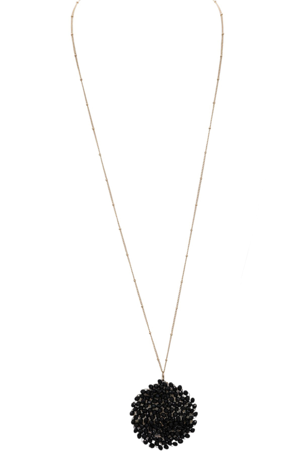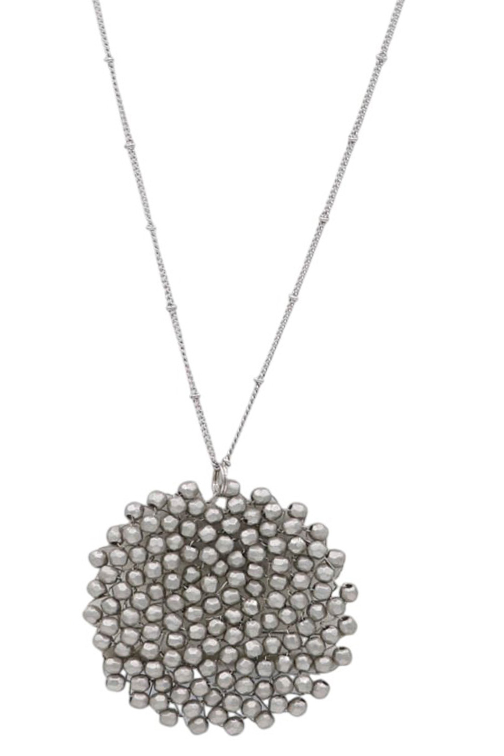 - Elevate your style with this captivating beaded pendant necklace, a true statement piece that blends artisanal charm with modern sophistication. The intricate design features a cluster of small, faceted gray beads artfully arranged and intertwined with delicate gold-toned wire, creating a captivating, organic texture reminiscent of a natural bloom or a celestial formation. Embrace the blend of earthy textures and refined metallic accents for a look that is both grounded and glamorous.