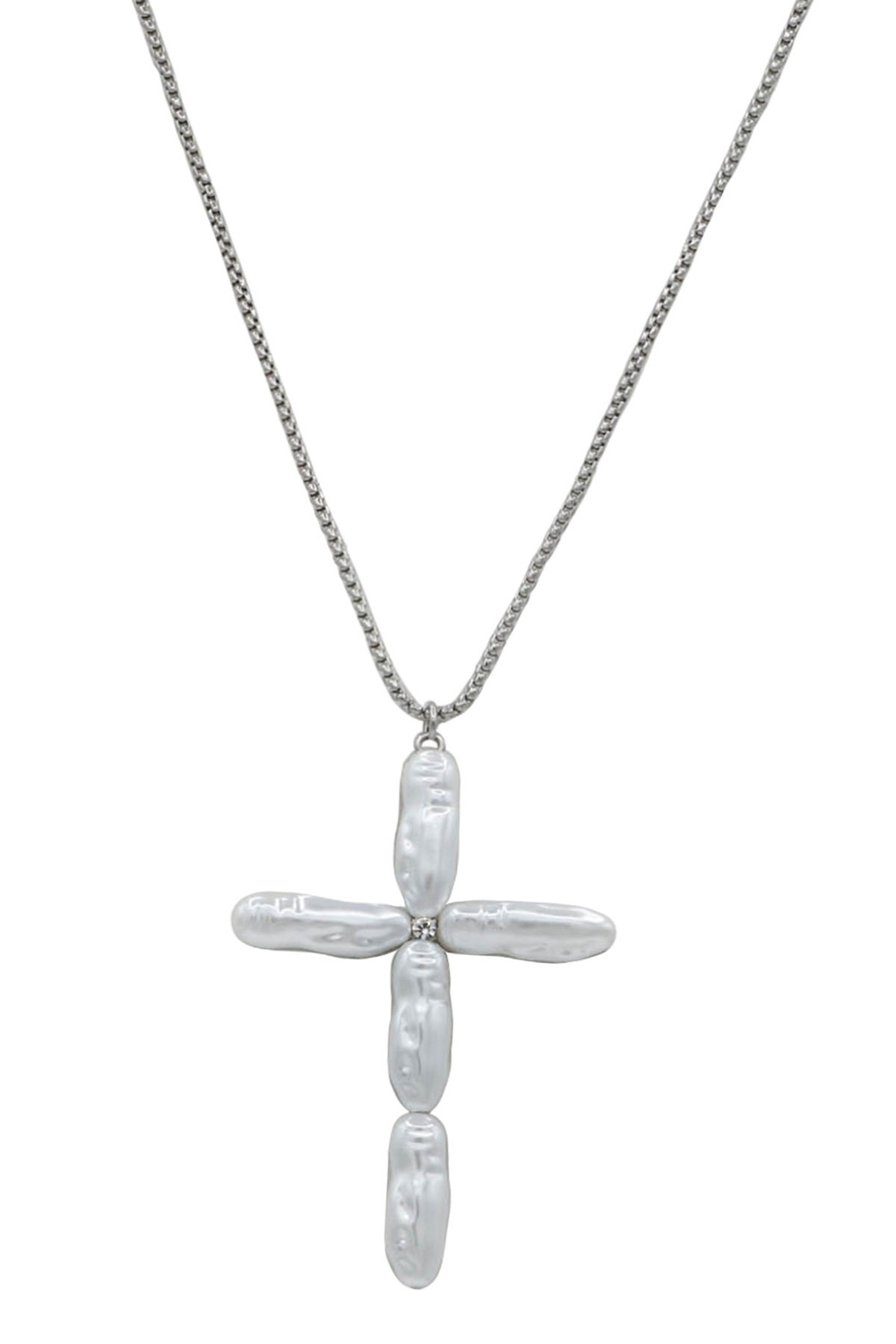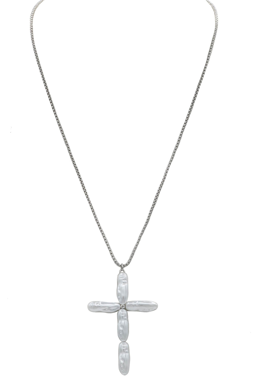 - Timeless long necklace showcasing a metal chain with pearl cross accent pendant.