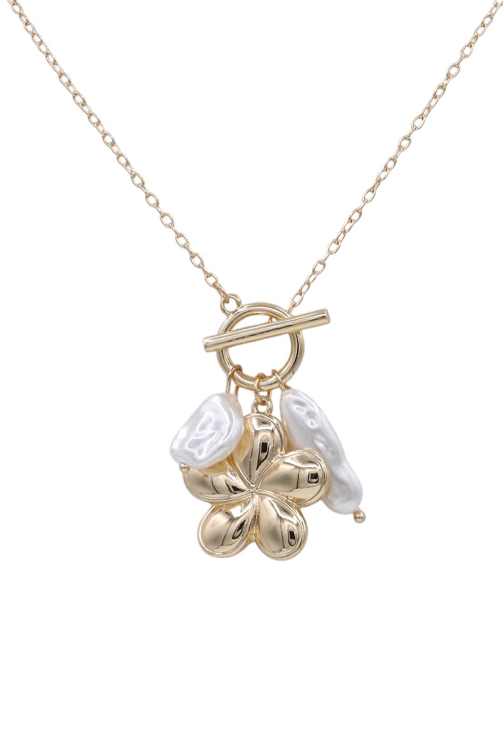 - Chic and feminine, this necklace pairs a metal flower pendant with pearl charms on a sleek chain for a soft, romantic, and layered look. Perfect for casual or dressy styling.