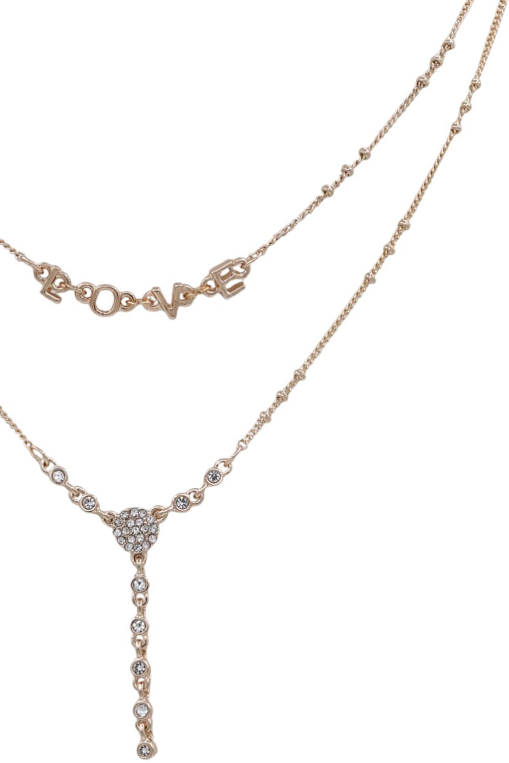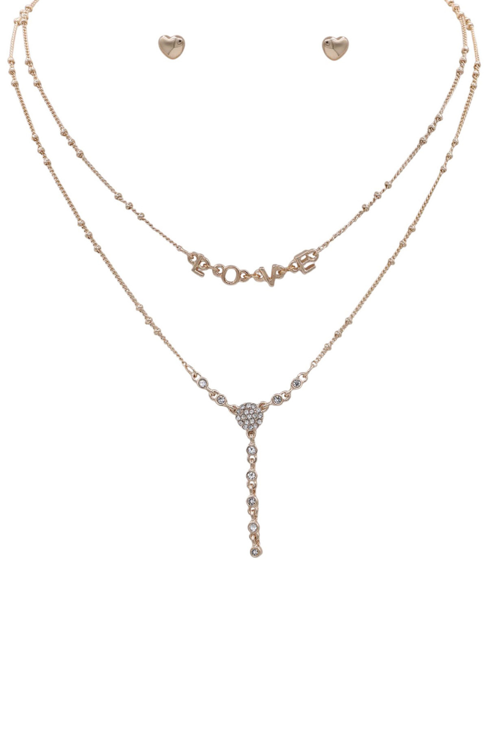 - Layered metal necklace set featuring a sparkling rhinestone and LOVE pendant for a sweet, stylish touch.