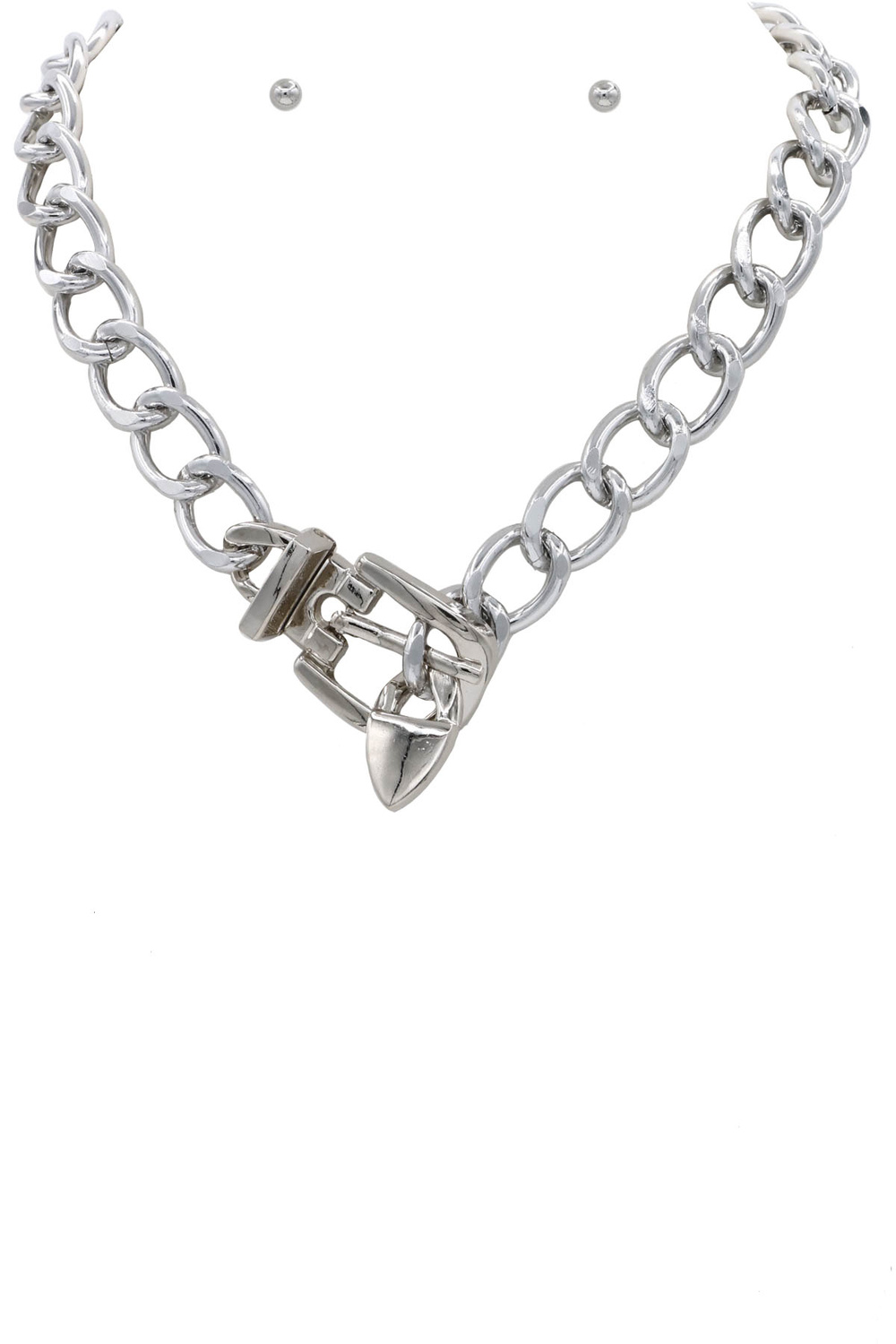 - A bold metal chain paired with a detailed belt buckle pendant creates a chic, edgy statement piece perfect for elevating everyday outfits.