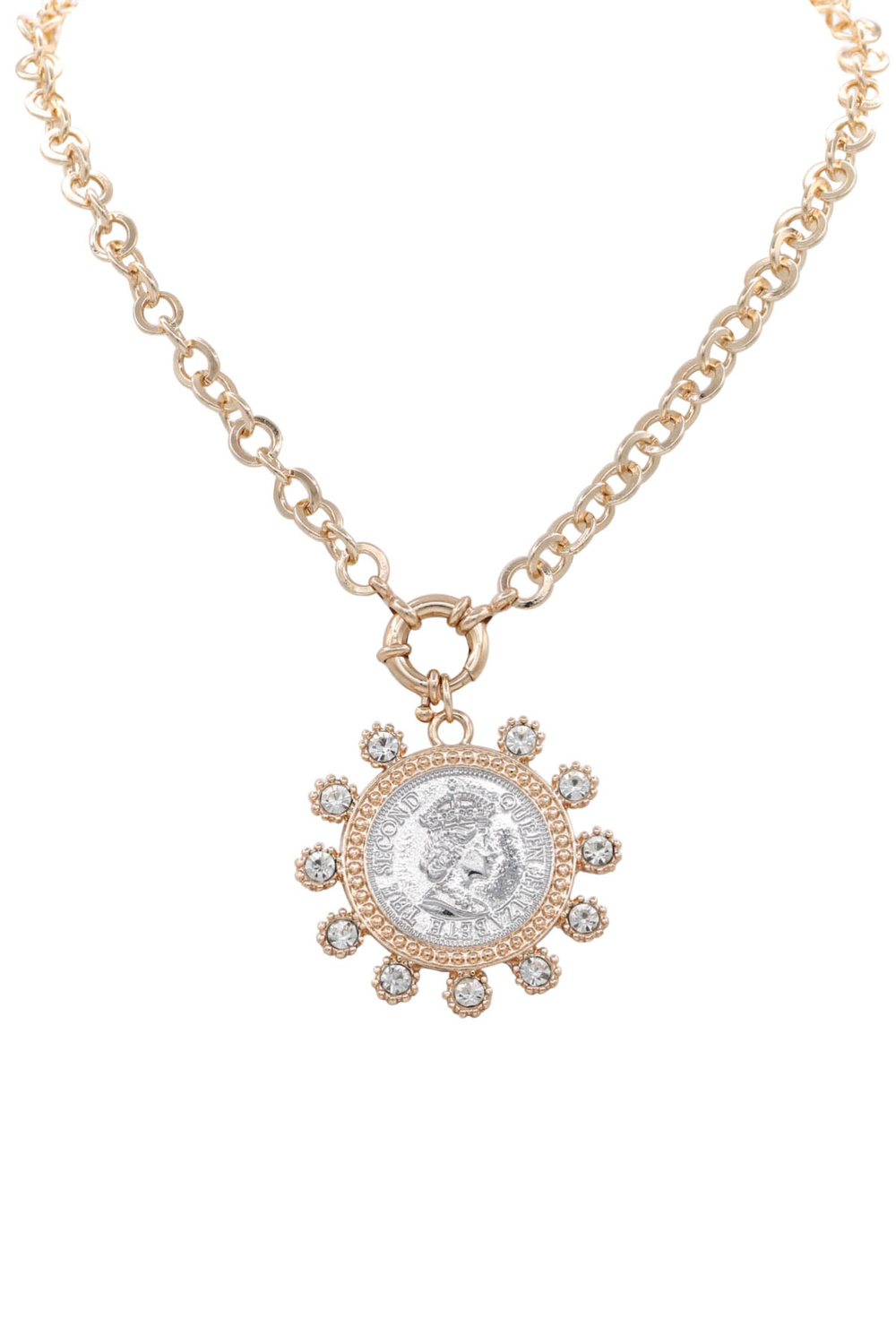 - This necklace showcases a Queen Elizabeth II coin pendant on a sleek metal chain, blending classic heritage with modern style.