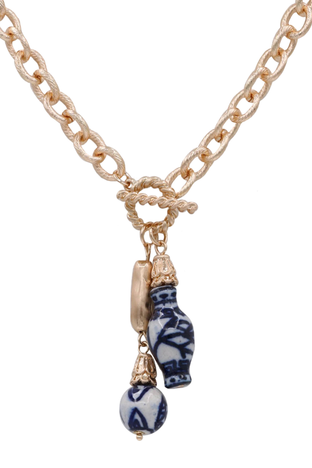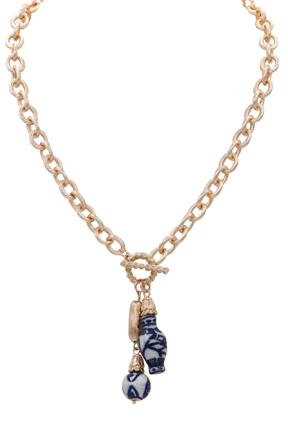 - Necklace featuring porcelain charms with a classic T-bar toggle closure. Clean, modern, and easy to style.
