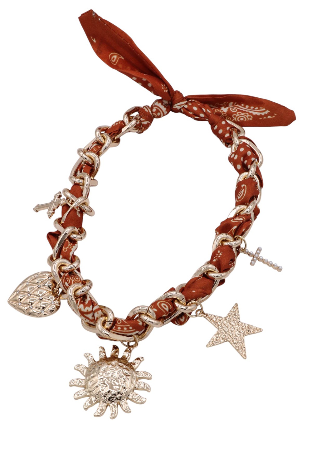 - Chic and symbolic, this fabric chain necklace showcases a mix of sun, star, and cross charms for a layered, celestial-inspired look. Perfect for adding meaning and style to any outfit.