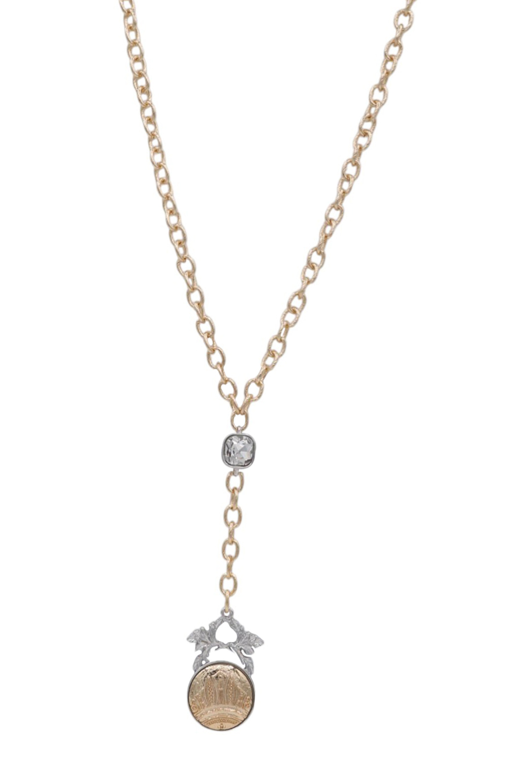 - A stylish long Y-lariat necklace featuring a textured chain accented with a sparkling jewel and pendant drop. Elegant and modern, this piece adds length and shine to any outfit.