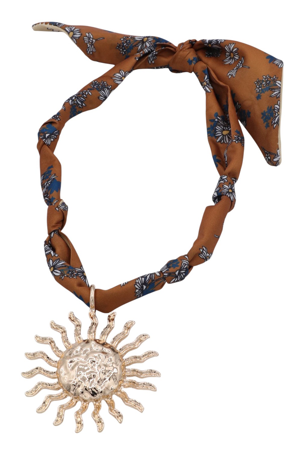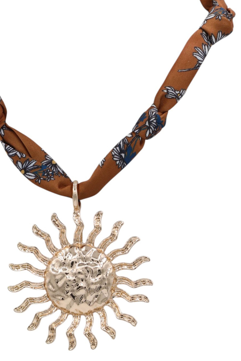 - Fabric necklace featuring a hammered metal sun pendant. Lightweight and unique-perfect for adding a touch of boho charm to any outfit.