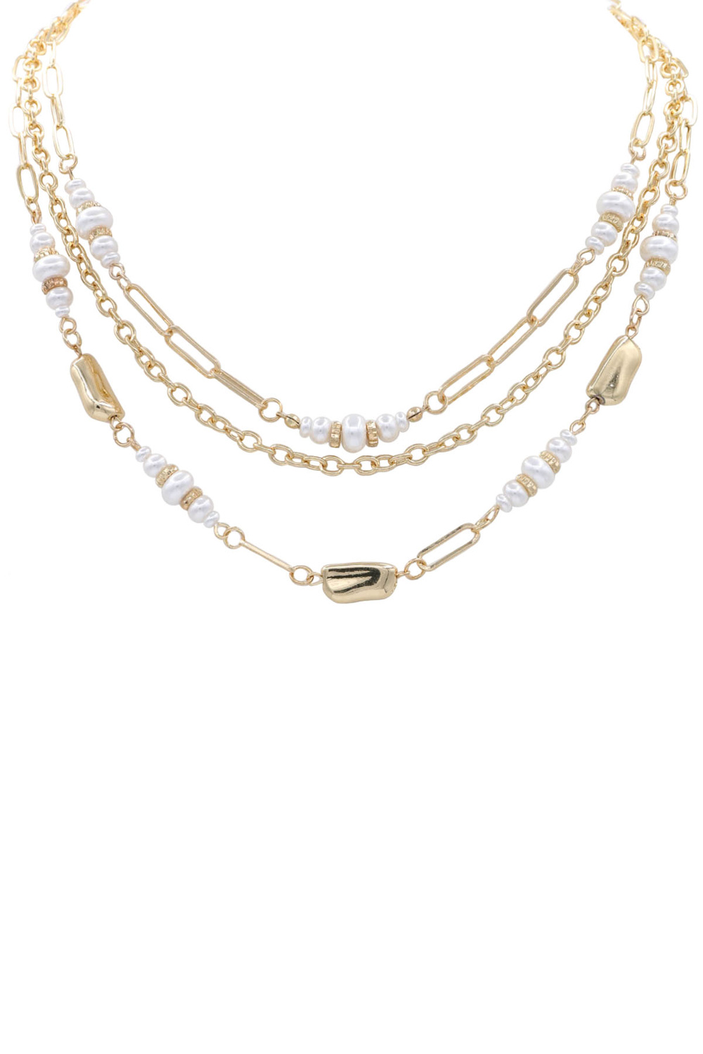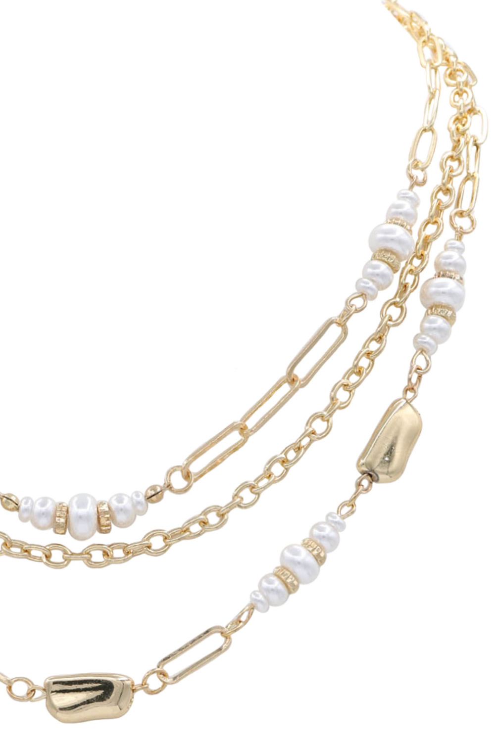 - A refined layered look featuring delicate metal chains adorned with multiple luminous pearls.