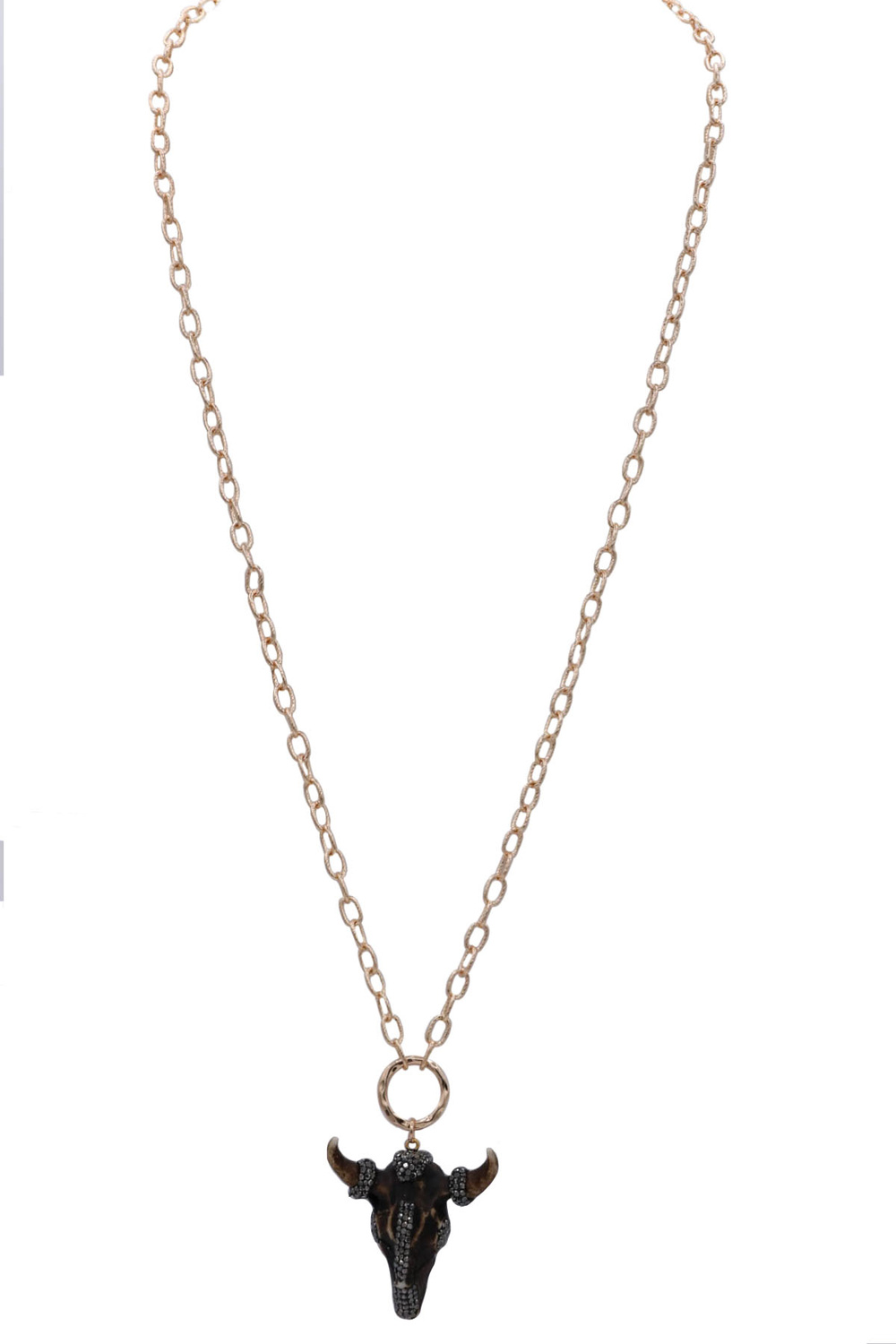 - A bold western pendant necklace featuring a detailed metal bull skull accented with sparkling rhinestones - the perfect cowgirl statement piece.