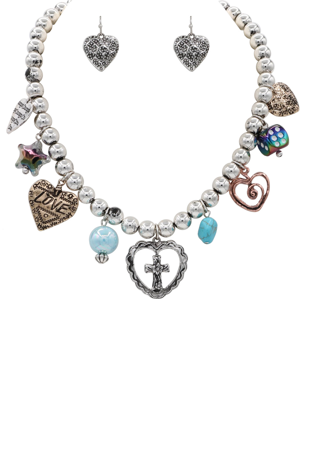 - A charming necklace set featuring metal beading accented with multiple heart charms. Playful yet polished, this versatile set is perfect for layering or wearing together for a sweet statement look.