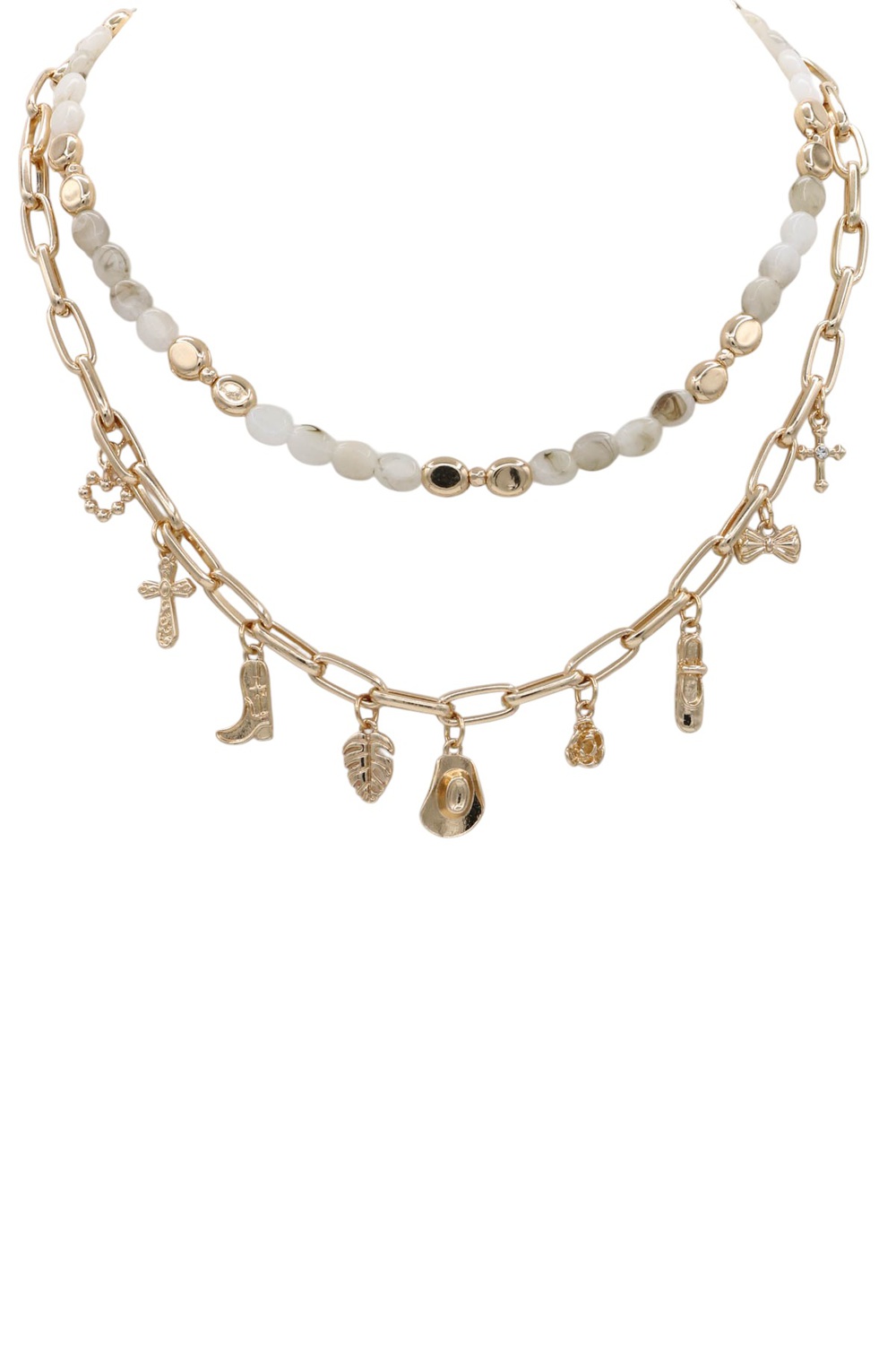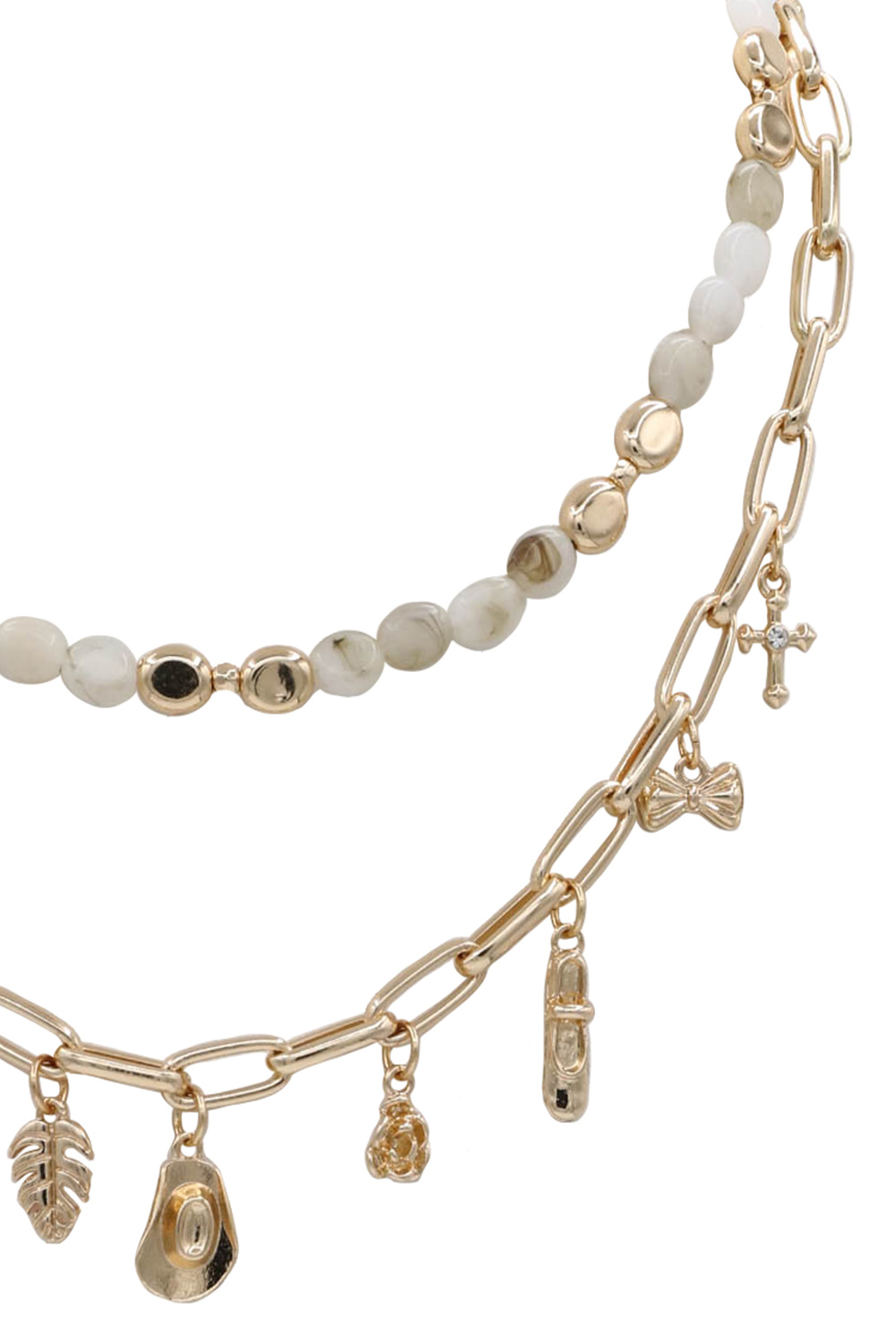 - Double-layered necklace featuring beads and charm accents. Lightweight and versatile for everyday wear.