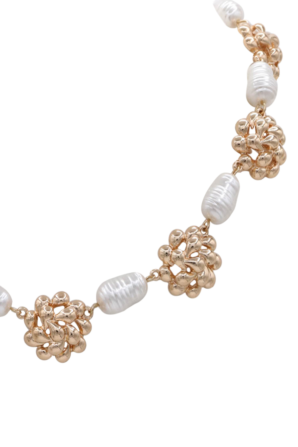 - Chic and feminine, this necklace showcases a metal flower motif paired with pearl link accents for a soft, romantic look. Perfect for layering or wearing solo.