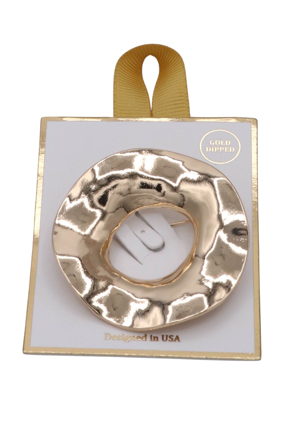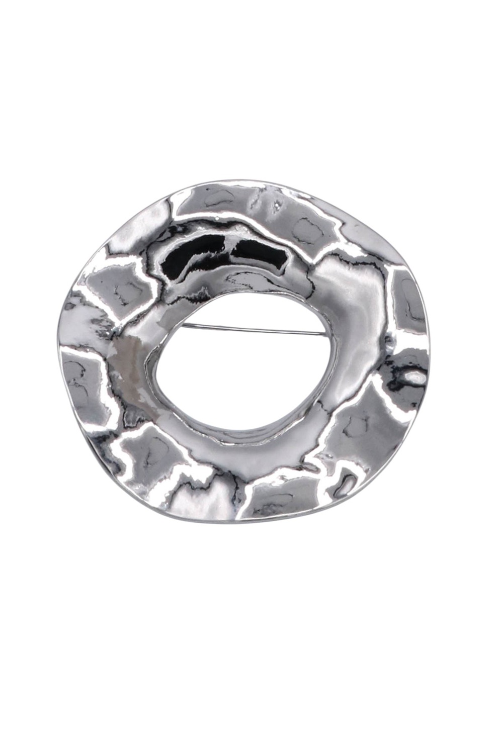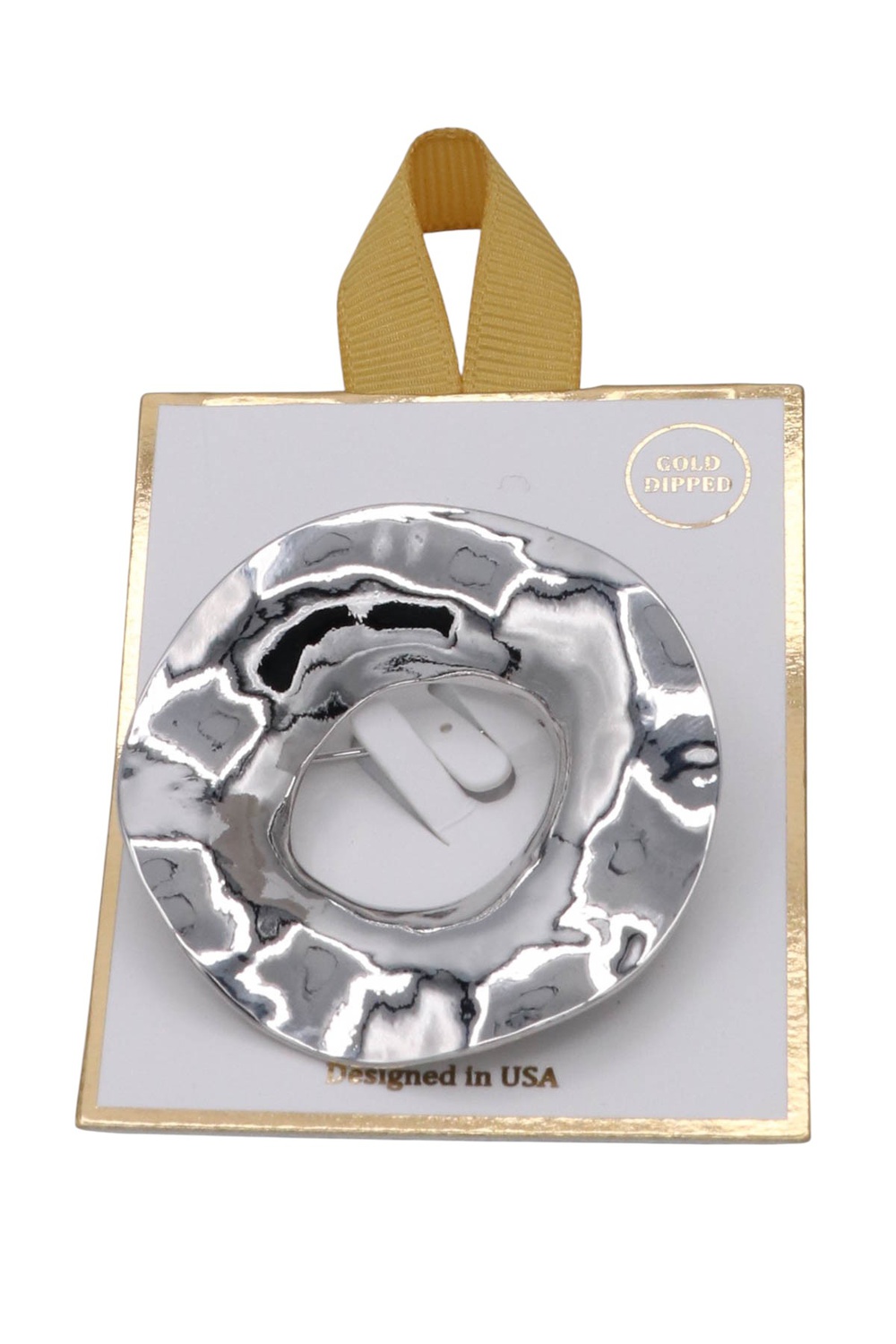 • Elegant round brooch crafted from hammered metal. Lightweight and versatile, a chic addition to any outfit or accessory.