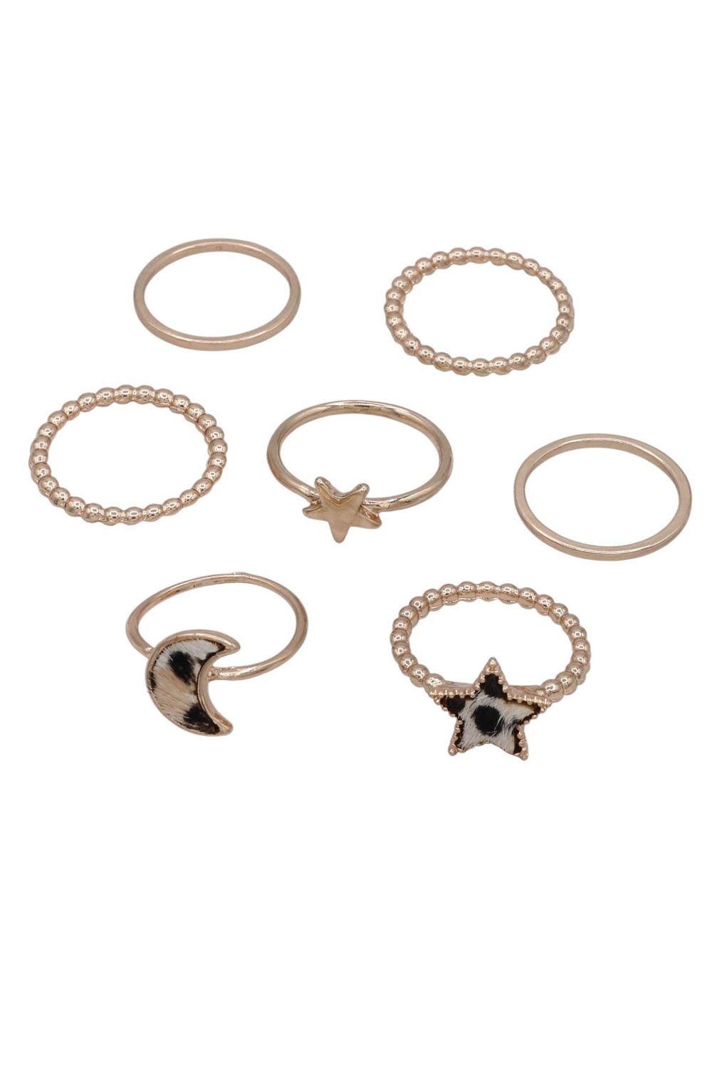 - This unique ring set blends genuine leather textures with mixed metal finishes and crescent motifs for a modern boho look. Wear stacked or individually for effortless style.