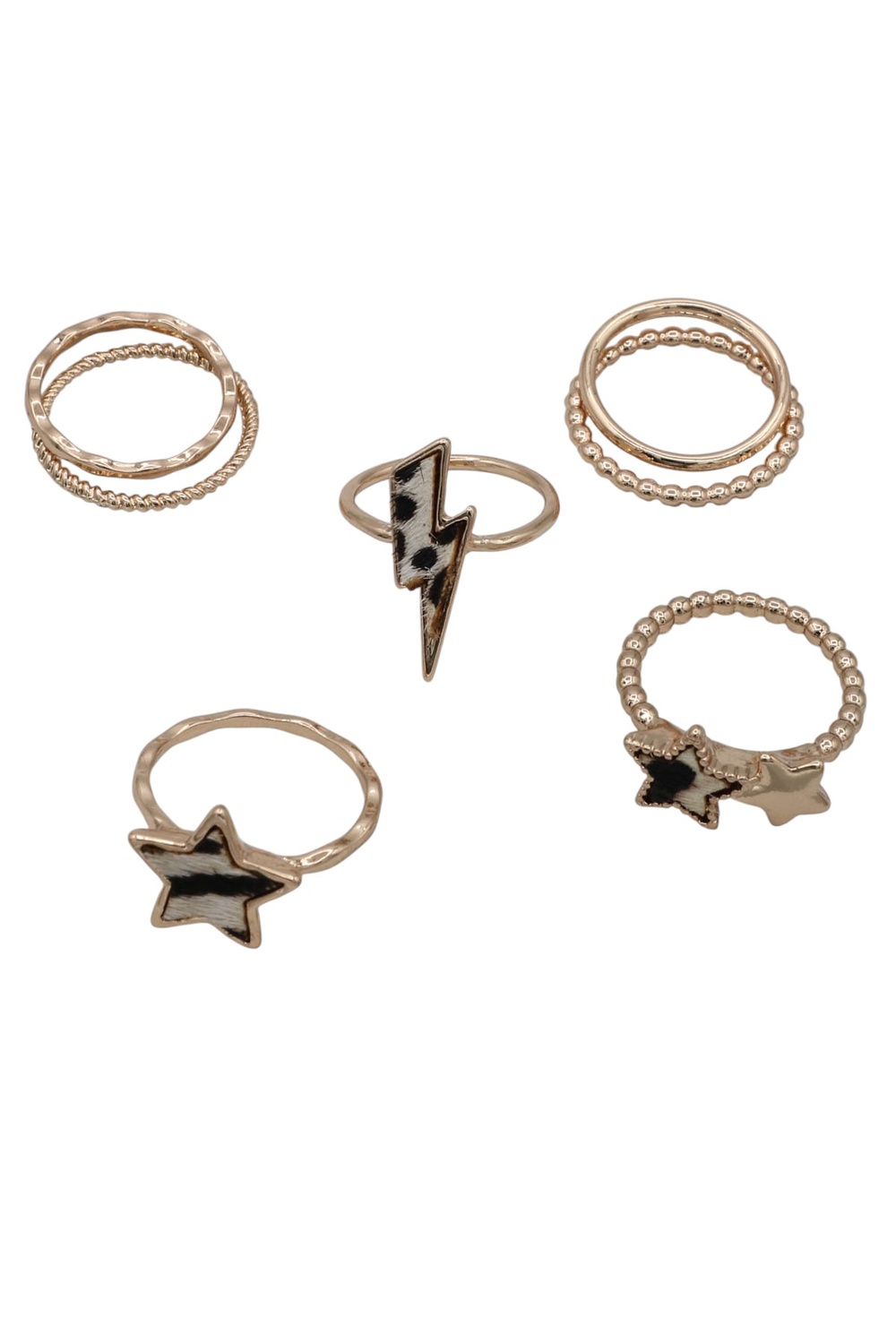 - This unique ring set combines genuine leather details with mixed metal designs and a lightning symbol for an edgy, fashion-forward look. Wear stacked or individually for standout style.