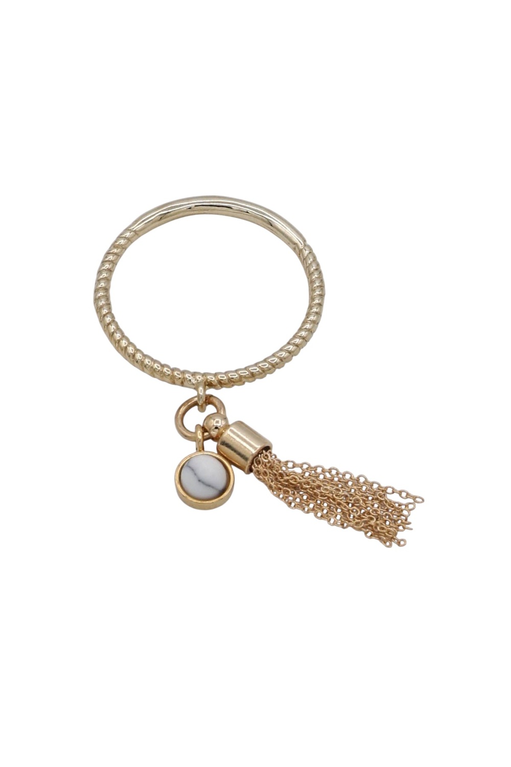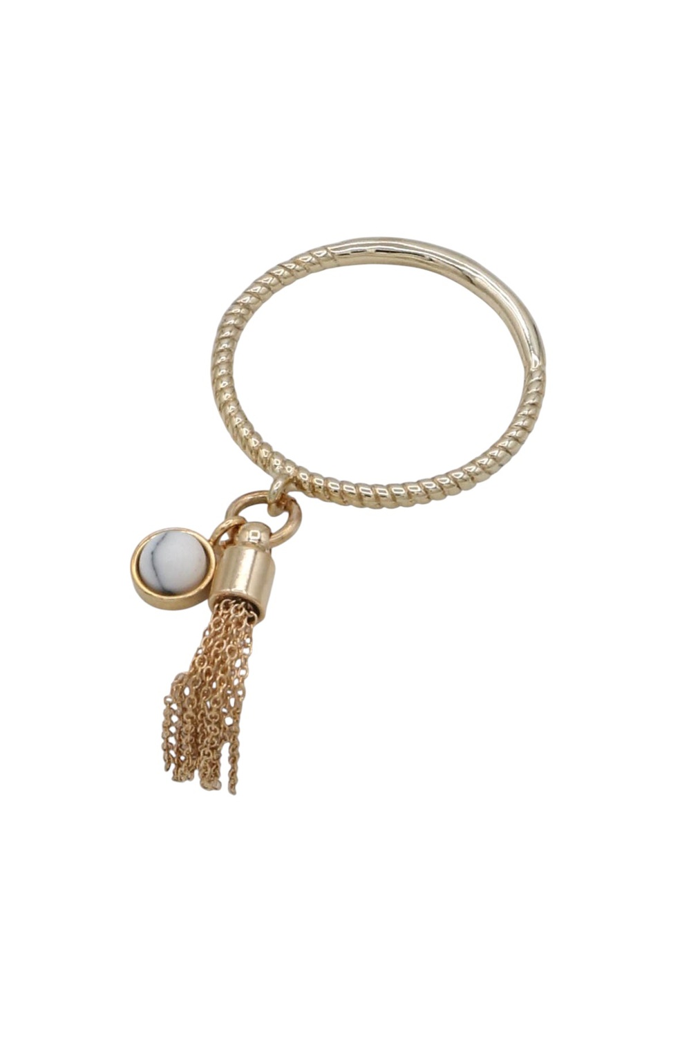 - A chic metal ring adorned with a dangling tassel and semi semi-precious stone charm. Adds boho flair and subtle sparkle to your jewelry collection.